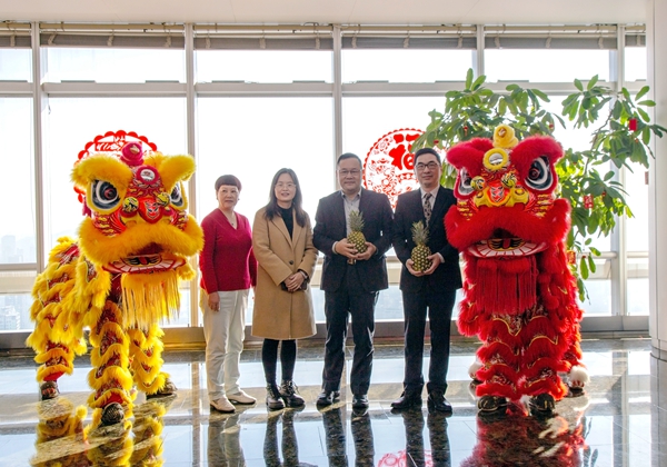 鏗鏗鏘鏘的鑼鼓聲中,雙獅眨眼賣萌、登高跳躍,獻上兩顆新嫩璀璨的大鳳梨,董事副總裁王偉文、資金部總經理李蘇作為代表,欣然接福。鳳梨在閩南一帶用俚語講,便是“旺來”,作為諧音,寓意極好。